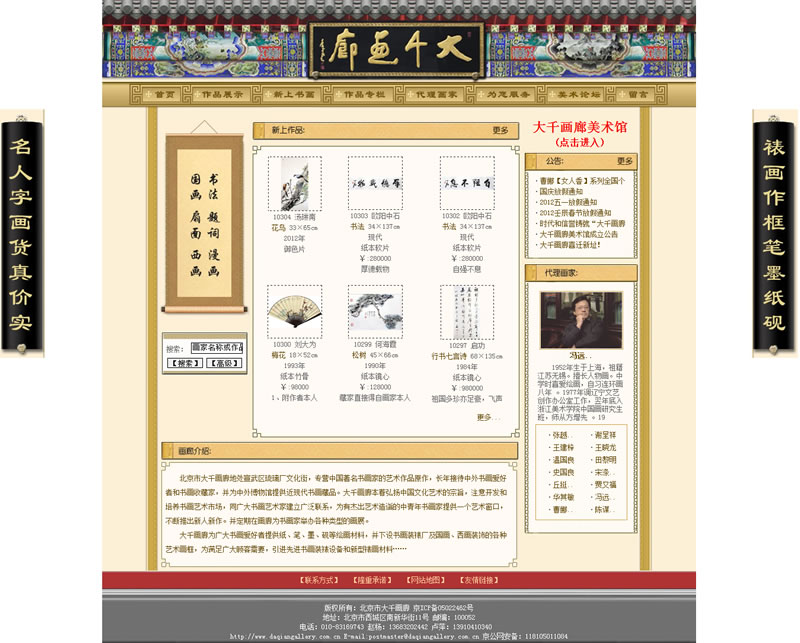 北京市大千畫廊地處西城區(qū)琉璃廠文化街,專營中國著名書畫家的藝術(shù)作品原作,長年接待中外書畫愛好者和書畫收藏家,并為中外博物館提供近現(xiàn)代書畫藏品。大千畫廊本著弘揚中國文化藝術(shù)的宗旨,注意開發(fā)和培養(yǎng)書畫藝術(shù)市場,同廣大書畫藝術(shù)家建立廣泛聯(lián)系,為有杰出藝術(shù)造詣的中青年書畫家提供一個藝術(shù)窗口,不斷推出新人新作。并定期在畫廊為書畫家舉辦各種類型的畫展。